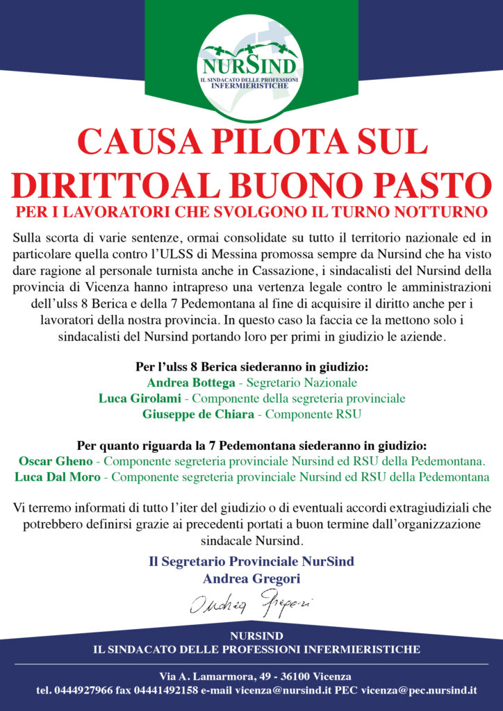 La segreteria NurSind di Vicenza, promuove attraverso i suoi rappresentati sindacali la causa sui buoni pasto.